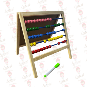 Este es un juguete educativo multifuncional que se presenta como un caballete de madera con una pizarra magnética y un ábaco incorporado, diseñado para el aprendizaje temprano de matemáticas, lectura y escritura.