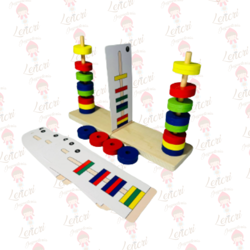 ¡Un desafío divertido para la mente! Este juego didáctico de madera está diseñado para desarrollar la lógica, la concentración y el reconocimiento de patrones y colores en los niños.