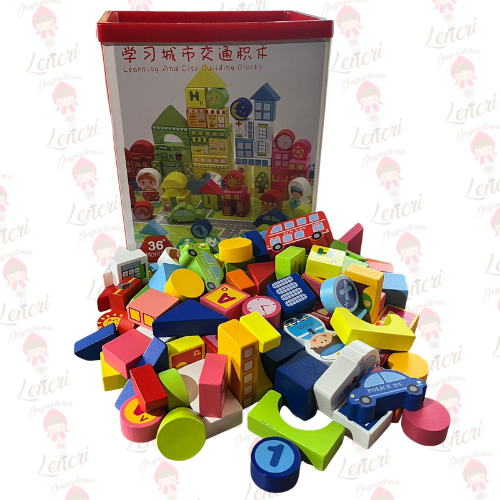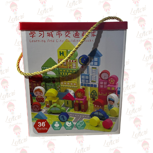 Este es un set de construcción de madera a granel que se presenta en un balde o contenedor de almacenamiento. El conjunto está diseñado para que los niños puedan construir y crear su propia escena de ciudad y tráfico.