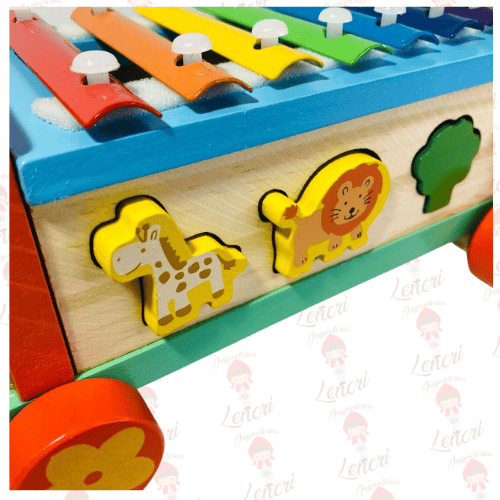 Este es un juguete multifuncional de madera que combina un xilófono musical con un bus clasificador de formas, proporcionando horas de juego y aprendizaje sensorial.