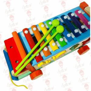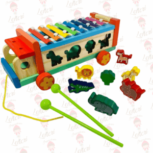 Este es un juguete multifuncional de madera que combina un xilófono musical con un bus clasificador de formas, proporcionando horas de juego y aprendizaje sensorial.