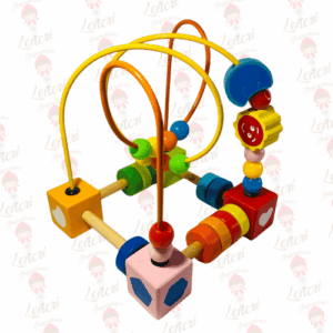 La base del juguete es un cubo de madera con bordes y lados decorados con formas y colores. De este cubo emergen dos alambres o rieles gruesos y curvos de colores vibrantes (naranja y amarillo), que forman un laberinto de cuentas o ábaco de cuentas tridimensional.