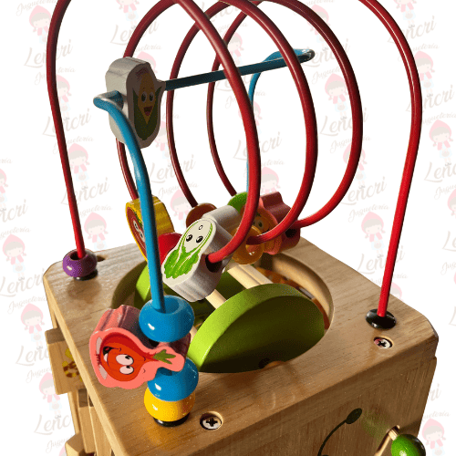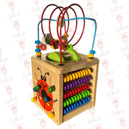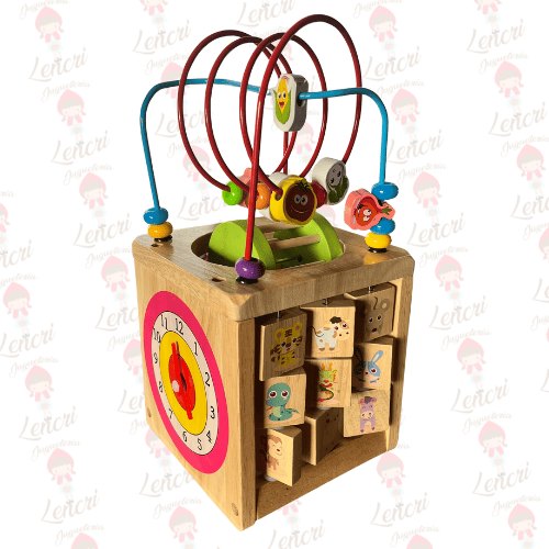 Este es un cubo de actividades multifuncional fabricado en madera, diseñado para ofrecer múltiples experiencias de juego y aprendizaje en cada una de sus caras. La parte superior está coronada por un laberinto de cuentas tridimensional, con cuentas de colores y formas variadas que se deslizan por los rieles curvos.