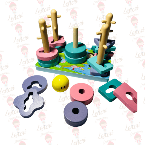 Este colorido juego de encaje y formas de madera es ideal para estimular el desarrollo cognitivo y la motricidad fina en los niños. Con piezas de diferentes colores y figuras geométricas, los pequeños deberán identificar y colocar cada forma en el espacio correspondiente del cilindro, fomentando el reconocimiento de formas y colores.