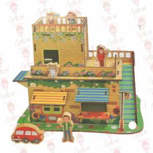 Este es un puzzle tridimensional armable que, una vez ensamblado, forma una encantadora casa de muñecas o casita de juegos de varios niveles. Está fabricado en un material de madera prensado ligero, con ilustraciones coloridas y detalladas.