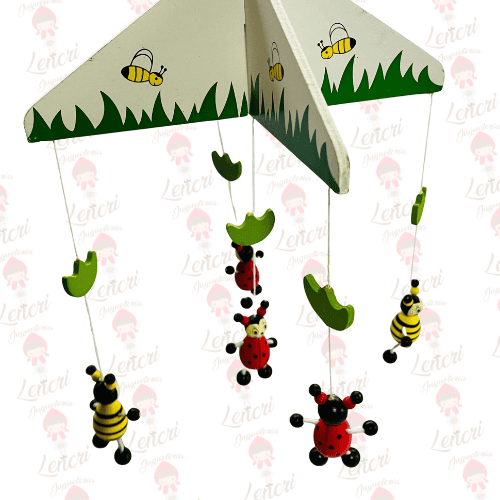 El móvil presenta una estructura de soporte superior en forma de paraguas o toldo, de color blanco con ilustraciones de abejas y pasto verde. De esta estructura cuelgan, mediante cordones, figuras de madera que representan: