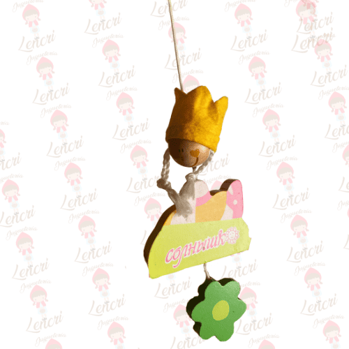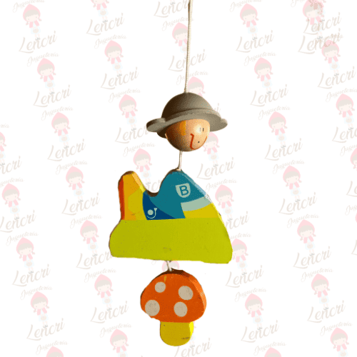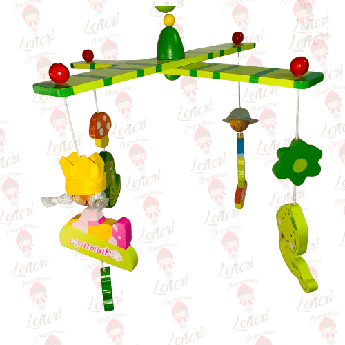 Este adorable móvil de madera presenta una estructura superior inspirada en una avioneta verde y amarilla, de la que cuelgan simpáticos personajes y elementos del bosque.