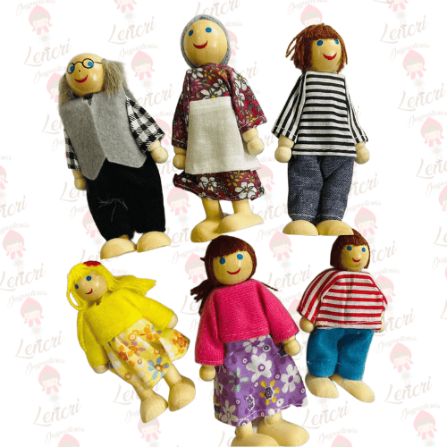 ¡La familia perfecta para el juego imaginativo! Este set de seis figuras de madera con ropas y detalles diferentes es ideal para poblar casas de muñecas, crear historias y fomentar el juego de roles en los niños.