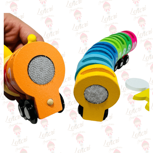 Este juguete educativo es una colorida oruga de arrastre de madera compuesta por segmentos que están unidos entre sí con velcro. Cada segmento del cuerpo de la oruga está pintado con un color vibrante del arcoíris y numerado del 1 al 10, sirviendo como una herramienta visual para aprender a contar y reconocer números.