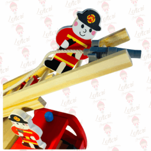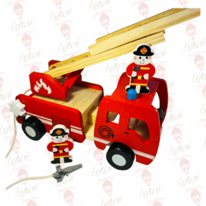 El camión cuenta con una escalera extensible y orientable de madera, que añade realismo y funcionalidad al juego. Incluye dos figuras de bomberos de madera, listas para ser insertadas en el vehículo o para jugar de forma independiente.